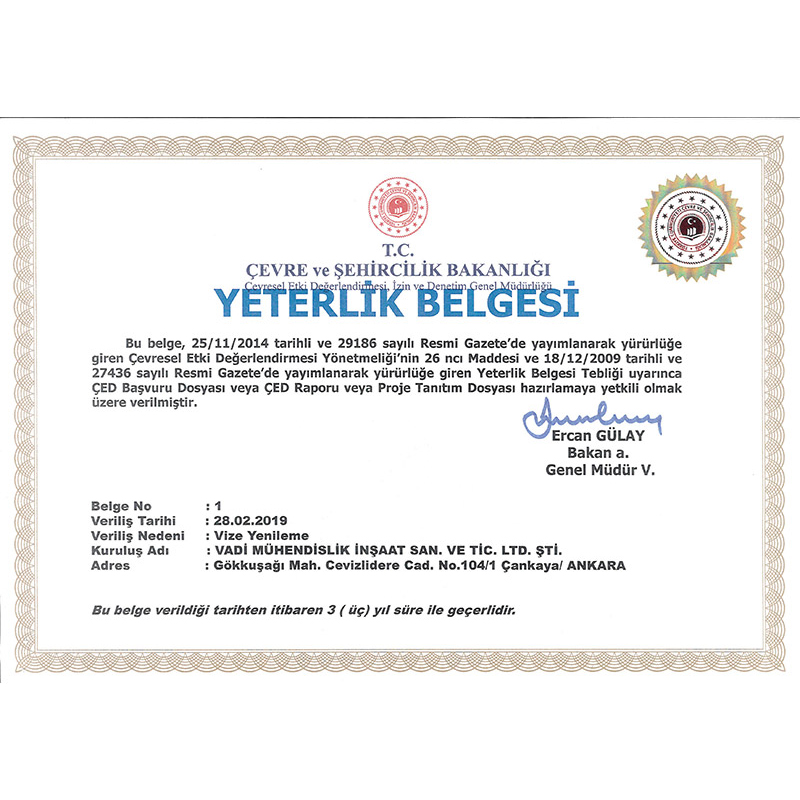 VADİ MÜHENDİSLİK, ÇED Konusunda Mühendislik, Danışmanlık ve Çevre konusunda hizmet vermek amacıyla kurulmuş olup, Çevre ve Şehircilik Bakanlığı tarafından firmamıza 001 Nolu “YETERLİK BELGESİ” verilmiştir.